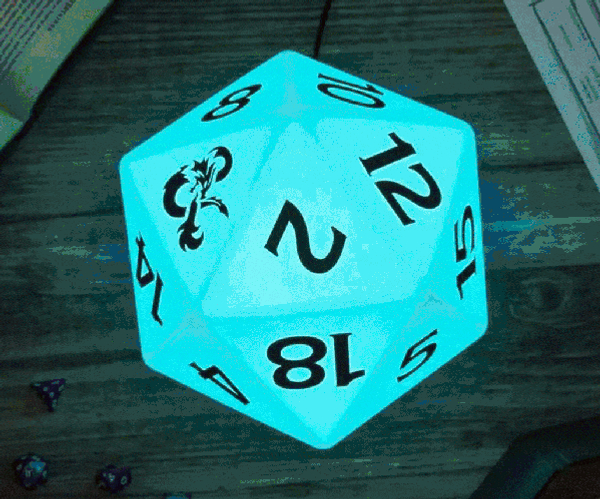 Roll a Nat 20 on good dreams with this lamp. It'll turn your dungeon into a place that dragons want to live and is a playful way to light up your next campaign with friends. The lamp cycles through an array of pretty colors and is about 8" in height.
