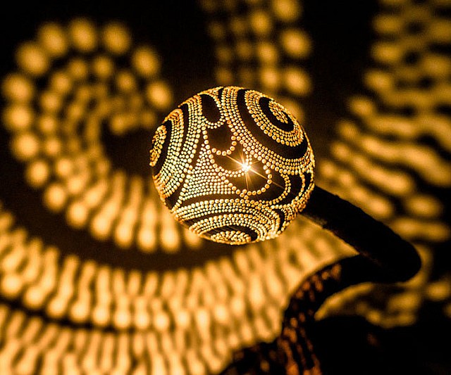 Who knew math could be so darn pretty? Fractals are the magic responsible for this table lamp, which casts a mesmerizing pattern of light on the wall. The size of the sphere holding the bulb is about 6" in size and it sits on a stand of either black or brown, your choice.