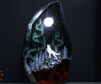 Bring the majesty of the Boreal forest right to your bedroom nightstand with this howling resin lamp. This artful lamp depicts a lone wolf howling at the moon while the Northern Lights illuminate the sky around him, a fantastic piece for animal and nature lovers.