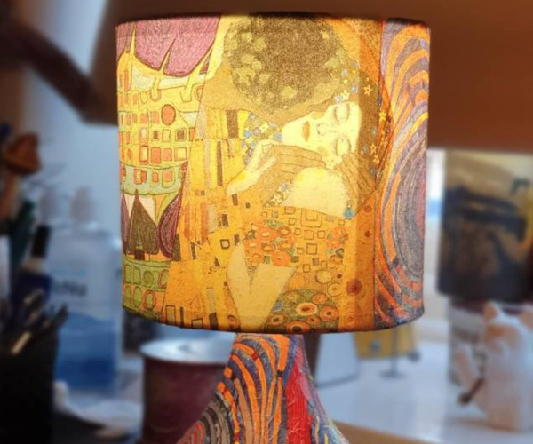 A lot of love and a little bit of decoupage went into making this extraordinary work of art. The Klimt work looks like something out of a museum and is a piece you'll have for years to come. The exquisite item has a teardrop base and is about 10" tall.