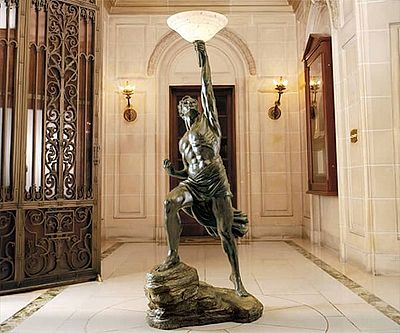 The Prometheus Sculptural Floor Lamp stands 74 inches tall and commands attention with its verdigris bronze finish. Hand-cast from crushed stone and resin, this artistic piece blends form and function, featuring a pedal switch and a warm, inviting glow.