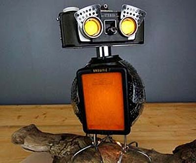 Add some unique eco-friendly lighting to your home with this recycled camera owl lamp. This wise looking owl lamp features a variety of recycled camera parts to give it a quirky and lovable design that is guaranteed to be your favorite lamp in your home.