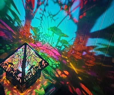 Bring whimsy into your everyday life with this wonderland lamp. Compact enough to fit comfortably on any desktop, each side of this handmade lamp is decorated with a forest landscape that will project a dream-like landscape onto the walls of the room.