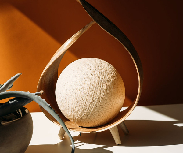 Invite a sense of calm into your space with a table lamp that is the embodiment of Zen. The handcrafted wood lamp is about 13" tall with subtle, natural curves and a balanced look. It's crafted with palm leaf and Albesia wood infused with a touch of futuristic flair and is made by artisans local to the area.